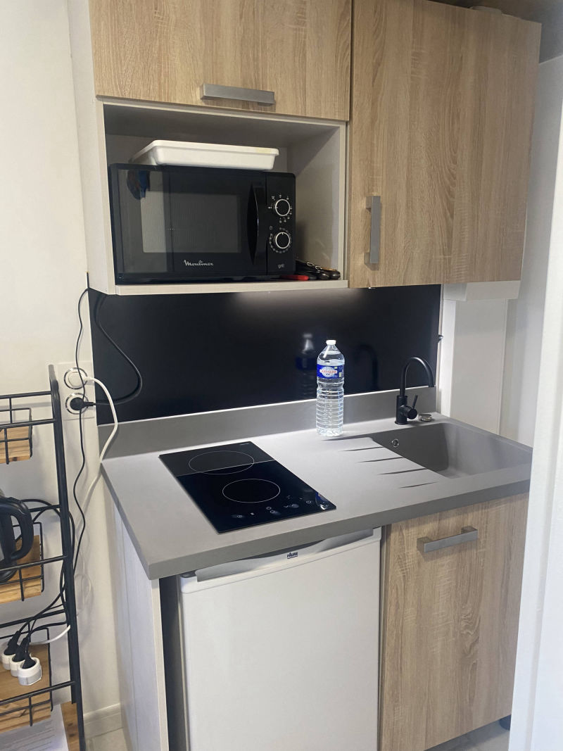 1 lit de 140 cm, kitchenette, frigo top, 2 plaques, micro-onde, climatisation, coin mini terrasse pour 2 : 2 tables et 2 chaises et 2 fauteuils. * Chambre non fumeur.